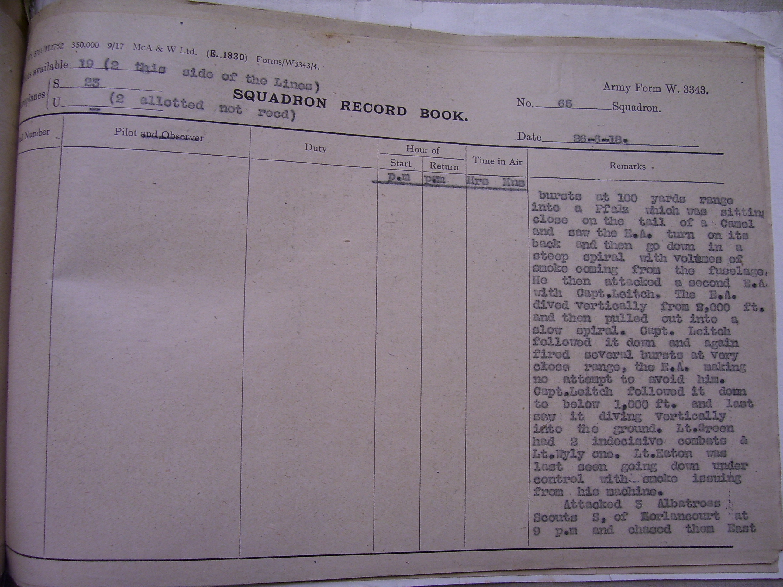 On November 10th he proceeded to France and was attached to the 65th Squadron of the Royal Flying Corps where he flew the legendary Sopwith Camel and according to the website theareodrome.com he was credited with 5 kills, making him an ACE.